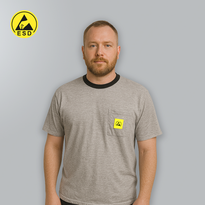 • Static Dissipative Fabric: Made from a blend of 47% polyester, 50% cotton, and 3% conductive fibre, these ESD T-shirts offer excellent electrostatic discharge (ESD) protection by dissipating static charge and preventing damage to sensitive equipment.