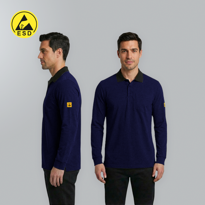 ESD POLO SHIRT NAVY BLUE - LONG SLEEVE   These high-quality ESD polo shirts are designed specifically for use in electrostatic discharge (ESD) protected areas. Manufactured from a static dissipativ