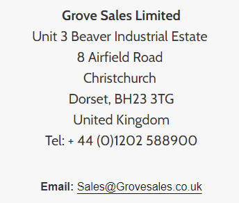 On 1st September 2015 Grove Electronic Sales business was transferred to Grove Sales Ltd, Registered No: 06187960. Registered Address: Ebenezer House, 5a Poole Road, Bournemouth, Dorset, BH2 5QJ Tel: 01202 312345.